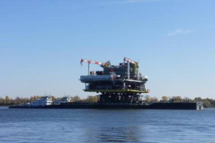 Вчера, 20 октября 2014 года, началась проводка верхнего строения ледостойкой стационарной платформы №1 в Каспийское море. Ее погрузили на транспортно-монтажную баржу «Юрий Кувыкин», на которой она и отправилась к месту назначения.