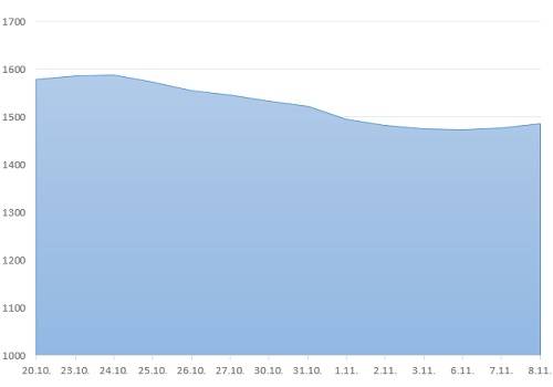 По данным Bloomberg Markets, 8 ноября 2017 г. индекс стоимости фрахта Baltic Dry составил 1486 пунктов, продемонстрировав повышение на 9 пунктов (+0,61%) относительно предыдущей отчетной даты (7 ноября).