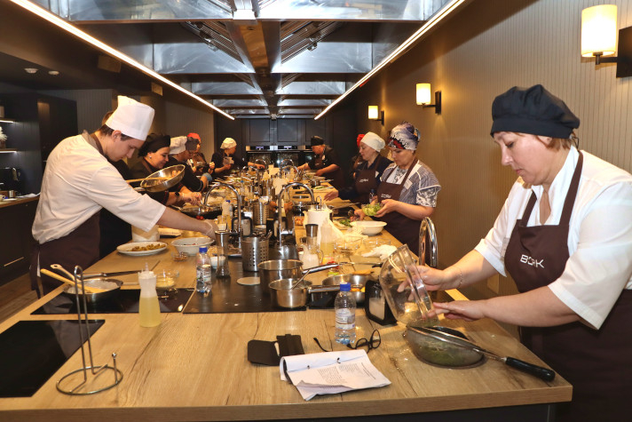 На первом, теоретическом этапе, повара прошли тестирование на знания технологии пищевого производства. На втором, практическом, они приготовили три конкурсных блюда: теплый салат с креветками, вешенками и грудинкой, бефстроганоф в сливках с белыми грибами и мини-картофелем на горячее и яблочный штрудель на десерт.