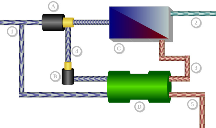 Схема установки опреснения на основе обратного осмоса. 1: Приток морской воды, 2: Поток пресной воды (40 %), 3: Поток соленого концентрата (60 %), 4: Поток морской воды (60 %), 5: Концентрат (слив), A: Насос высокого давления, B: Циркуляционный насос, C: Осмотический модуль с мембраной, D: Устройство обмена давлением. Источник: Wikipedia.org