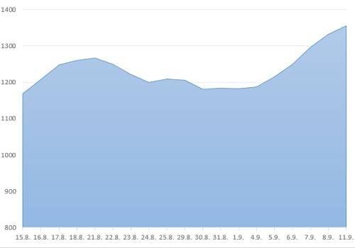 По данным Bloomberg Markets, 11 сентября 2017 г. индекс стоимости фрахта Baltic Dry составил 1355 пунктов, продемонстрировав рост на 23 пункта (+1,73%) относительно предыдущей отчетной даты (8 сентября).