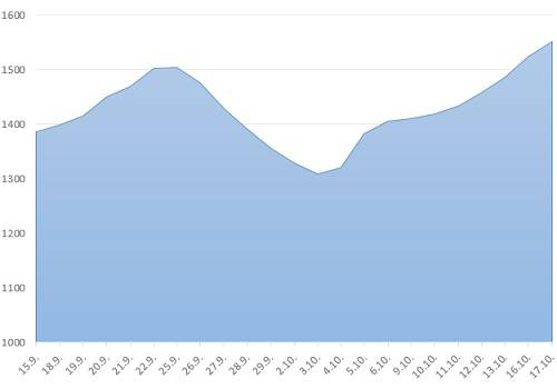 По данным Bloomberg Markets, 17 октября 2017 г. индекс стоимости фрахта Baltic Dry составил 1552 пункта, продемонстрировав увеличение на 29 пунктов (+1,90%) относительно предыдущей отчетной даты (16 октября).