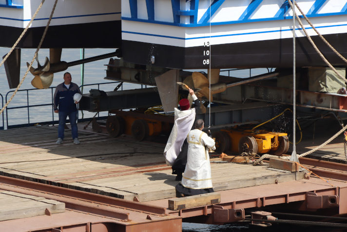 После доклада старшего строителя заказа была дана команда на спуск. Спустя некоторое время новое судно оказалось в своей традиционной стихии.