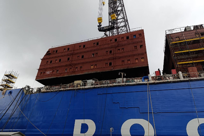 «Балтийцы впервые установили на ледокол проекта 22220 укрупненный блок секций жилой надстройки. В нем уже смонтированы трубопроводы вентиляции и общесудовых систем, двери, иллюминаторы, электрослесарное насыщение, – поделился генеральный директор Балтийского завода ОСК Александр Коновалов. – Мы восстанавливаем свои компетенции и будем развивать технологию крупноблочного строительства. В планах работа с более насыщенными и крупными конструкциями весом от 800 тонн».