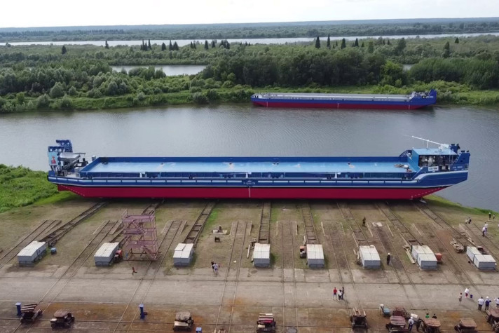 На Самусьской судоверфи спустили на воду сухогрузную аппарельную баржу-площадку