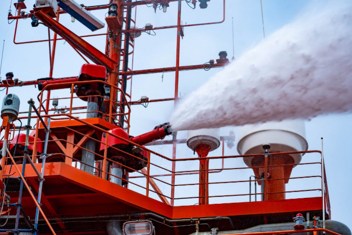 Как уточняют на АСЗ, система полностью интегрирована с судном и включает в себя систему водяных завес и систему пенотушения.