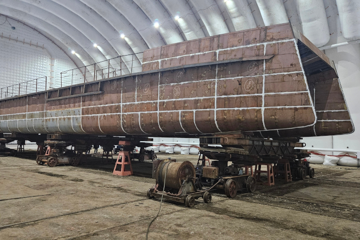Строящееся судно перемещено в специально возведённый ранее пневматический эллинг, где будут проведены механомонтажные, трубопроводные, малярно-изоляционные и электромонтажные работы, а также работы по монтажу надстройки из сплава АМГ.